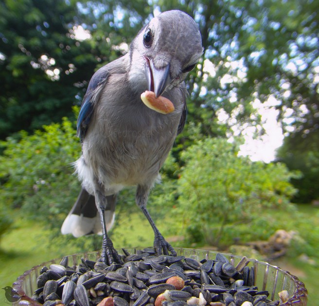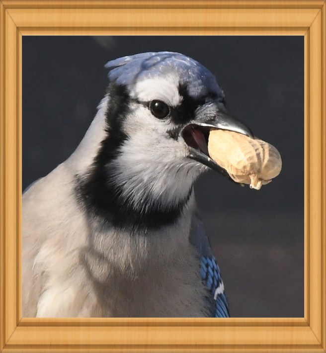 I wrote this poem after watching a jay at our feeder in Ann Arbor and deciding that even though he could take all the peanuts he wanted – based on his size relative to the other birds – he preferred to steal the peanuts and then celebrate his cleverness. My brother says the sound of blue jays is the sound of Michigan.